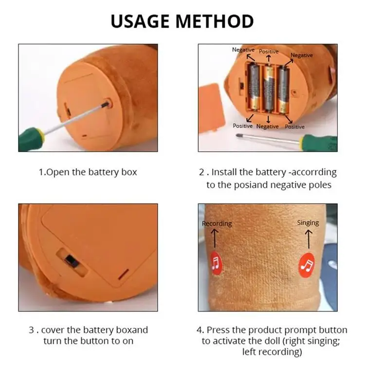 a pelúcia balançará e cantará músicas!Já que a boneca contém eletrônicos